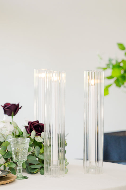 Luxury LED Taper Candle Set with Ribbed Glass Cylinders - 11" & 14" | Realistic Flameless Candles for Weddings & Events